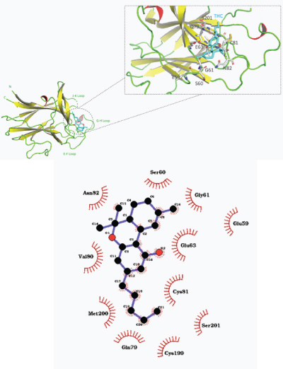 Figure 6: a) Overall structure of predicted binding pose of tetrahydrocannabinol (THC) with EphB2 receptor ligand binding domain. b) 2–D representation of THC–EphB2 binding domain complex with hydrophobic contacts shown by arc spokes.
