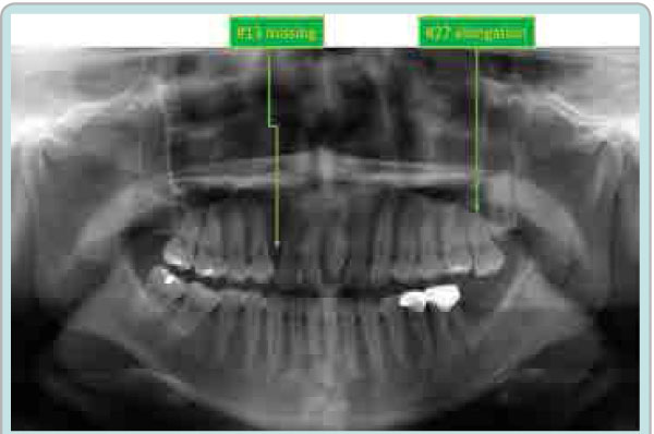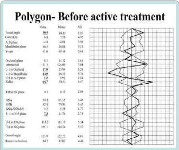 The space analysis showed 8.0 mm of space deficiency in the upper dentition and 1.5 mm space deficiency in the lower dentition. Both upper and lower dental arches were symmetric ovoid shape (Figure 1). Panoramic findings showed #13 missing and #27 elongation (Figure 2). Cephalometric analysis indicated that this patient had a skeletal Class I pattern with an ANB angle of 3.4 ° with a mean mandibular angle. The upper incisor positions showed tendency of mild retroclination measured from U-1 to A-P plane of 5.3mm. The mandibular incisors were retroclined as compared to norms. (Figure 3, Table 1).