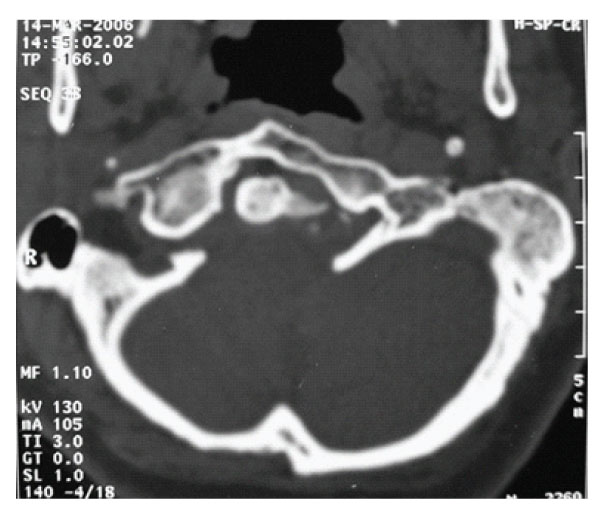 Figure 1: Axial slice of CT scan showing anterior assimilation of Atlas and asymmetric condyles.