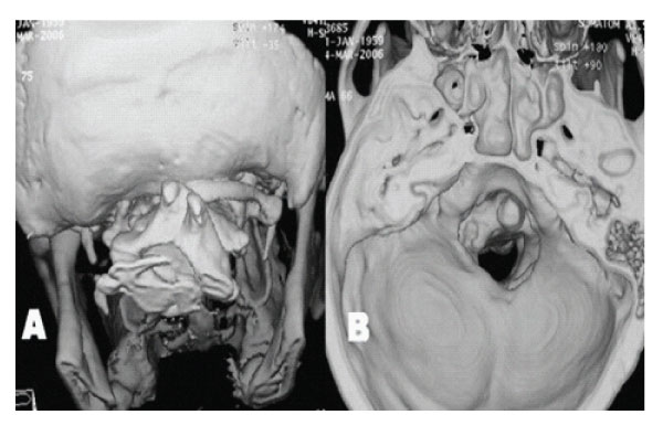 Figure 2: A: 3 D reconstructed CT scan showing assimilation of right posterior arch of Atlas, its right posterior arch can be seen. B: 3 D reconstructed CT scan showing inner aspect of posterior cranial fossa. A narrow, asymmetrical foramen magnum and shallow posterior fossa are seen.