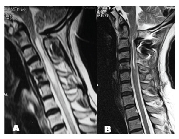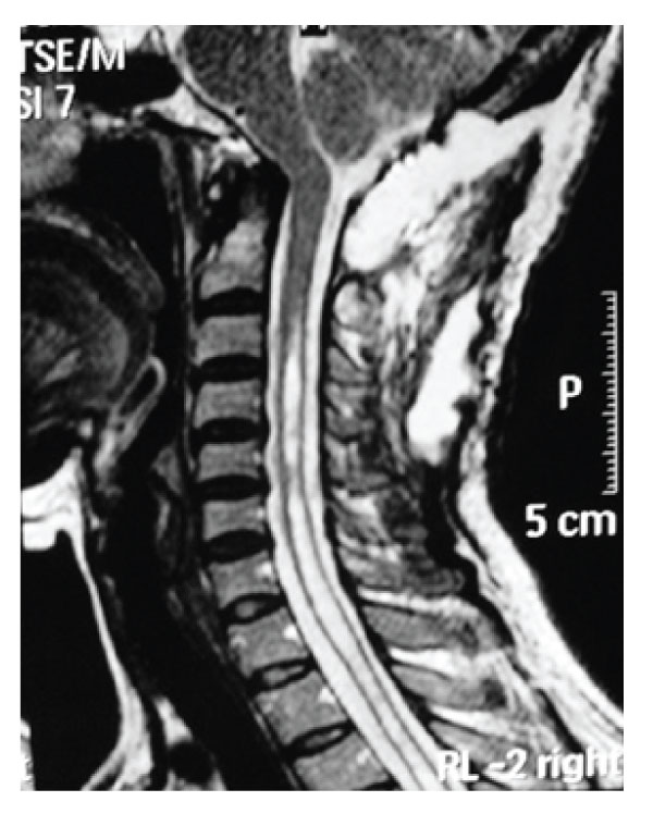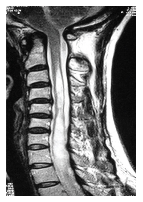A 45 years old woman was admitted to the hospital with a history of progressive weakness and numbness of the upper extremities. She also had a headache worsening with coughing and gait disturbance. Neurological examination revealed spasticity and weakness of extremities with hyperreflexia. Paresthesia, decreased pain and temperature sensation under C3 level were also observed. Lateral X-rays showed bony abnormality at the craniovertebral junction without basilar invagination. Dynamic