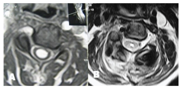 Figure 4: T2 weighted axial MRIs taken at C5 level demonstrating resolution of syringomyelic cavity. A: Preoperative. B: Postoperative.