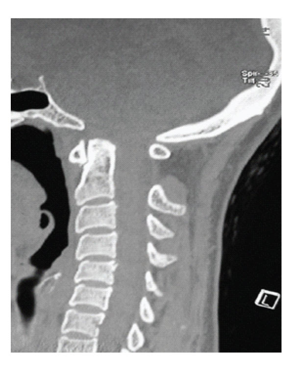 Figure 6: Case 2 Pre-operative Sagittal CT scan showing short clivus and short basis occiput associated with small posterior fossa.