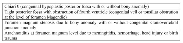 However, every patient could not be put only in one group. For example, a patient with hypoplasic posterior fossa may also have a foramen magnum obstruction with bony anomaly or a veil at foramen Magendie level. Our second case had a smaller posterior fossa suggesting “Chiari 0” although no intradural veil was found.