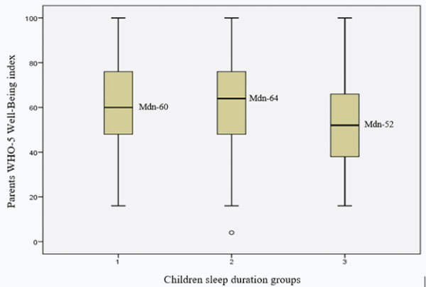Kruskal–Wallis test was used to compare the mean ranks of parents' The WHO–5 Well–Being Index, according to children's sleep duration. The obtained result showed that the difference between the groups is not statistically significant (χ2=5.877, p=0.053). The distribution of groups is represented in Figure 3.