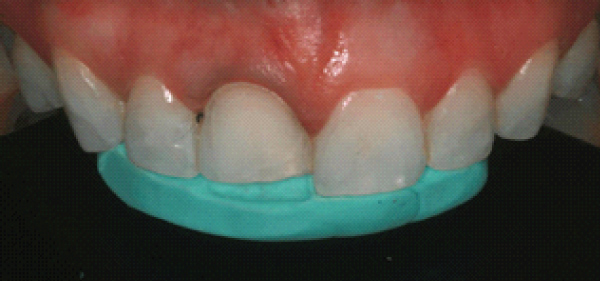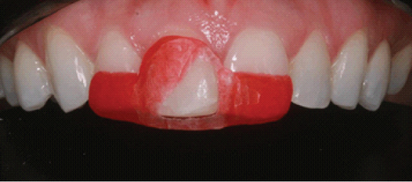 The decision for a ceramic veneer on tooth 11 was made with the patient, who desired an aesthetic, conservative treatment with greater clinical longevity. After a thorough clinical examination, it was observed that tooth 11 was slightly proclined and minimally rotated in relation to neighboring teeth. Thus, it would be safer to make a wear matrix to guide the preparation of this tooth (Figure 2).