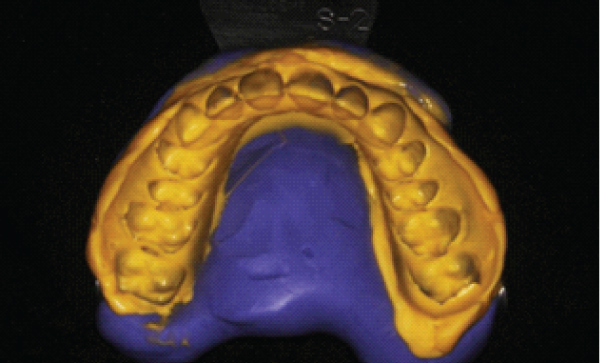 The upper and lower arches were anatomically molded with condensation silicone (Perfil®, Vigodent S/A Indústria e Comércio, Rio de Janeiro, R.J., Brazil) and cast with alginate Hydrogum 5® (Zhermack, Badia Polesine, Italy) and cast with special stone cast Herostone® (Vigodent S/A Indústria e Comércio, Rio de Janeiro, R.J., Brazil) to obtain the diagnostic wax-up and wear matrix, both performed in the laboratory. The interocclusal registration was re-performed in maximal habitual intercuspation (MHI) with dense paste of the same condensation silicone.