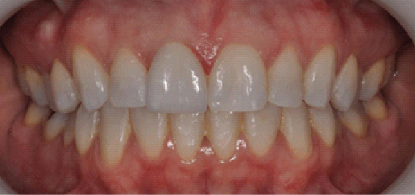 Again the Ultrapak® Retractor wire number 000 (Ultradent Produtos Odontológicos, Indaiatuba, SP, Brazil) was inserted into the tooth in question and the substrate was conditioned with 37% phosphoric acid Condac37® (FGM Produtos Odontológicos, Joinville, SC, Brazil) for 30 seconds in enamel and washed with plenty of water for 20 seconds. Cementation was started by manipulating the purely light-activated resin cement Variolink® Esthetic LC, Ivoclar-Vivadent® (Ivoclar-Vivadent, Barueri, SP, Brazil) in a 1:1 ratio. After the piece had settled on the substrate, excess cement was removed with an insertion spatula, brush and dental tape. The polymerization proceeded for 60 seconds on the buccal and incisal surfaces of the element and subsequent removal of the retractor wire. After fully completed the cementation process (Figure 6), occlusal analysis was performed in maximal habitual intercuspation and during the anterior and canine guides.