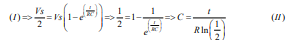According to equation (I), the moment t when the capacitor voltage reaches the reference voltage Vr (assuming Vc = Vr = Vs/2), the capacitance will be given by the formula: