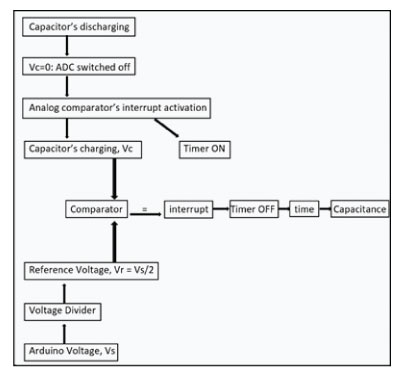 As explained previously, in an RC circuit where voltage Vs is applied, the voltage across capacitor Vc is given by the equation (I). In this device, using the built-in analog comparator of Funduino ATmega328P microcontroller, the time when the capacitor voltage becomes greater than half of the applied voltage (Vc > Vs/2) will be detected.
