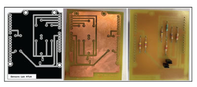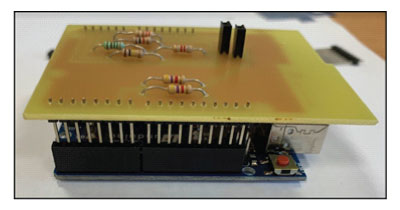 Afterwards, the miniaturization of the device was examined. The breadboard was replaced by a small printed circuit board (PCB) constructed to fit on the Funduino. The layout of the board was designed using the KiCad software. The copper layer was printed on a slide, which was placed onto the board with lightsensitive coating and then they were exposed to ultraviolet light. Afterwards, the PCB was rinsed with water and placed in NaOH solution to remove the UV exposed areas. After the appearance of the conductive tracks, the etching followed and the board was placed in FeCl3 solution, on a stirrer to remove the unwanted copper from the PCB. Finally, the appropriate holes were drilled and the resistors of the breadboard were soldered to the board. The black components are the socket pins to which the capacitor to be measured is connected. The small PCB was finally placed on the Funduino with the pins connected properly so that the device has smaller dimensions, 8cm x 6cm x 1.6cm (length x width x height) and weighs about 70g.