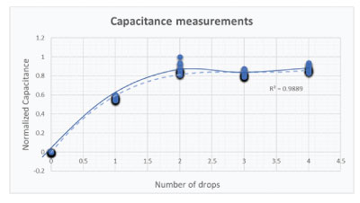 As expected, the diagram presents that for the first two drops the capacitance shows an increase while for more drops it remains almost stable at the value reached after the surface of the capacitor is covered.