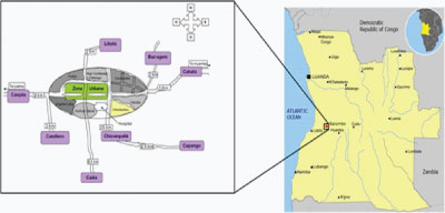 Figure 1: Map of the area in Angola and localization of the 8 studied villages (from Brosseau et al., 2012).