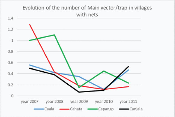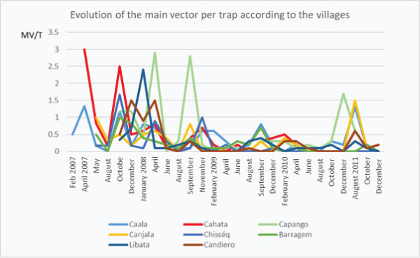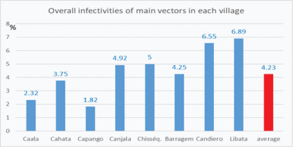 It appeared villages with low infectivity # 2% (Capango, Caala), “middle” infectivity, on the range of the average (Cahata, Canjala, Barragem) and villages with high infectivity (Candiero, Libata) of main vectors (graph 4b)