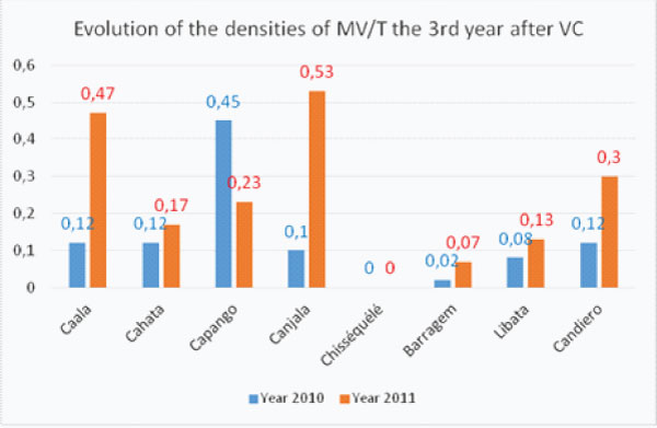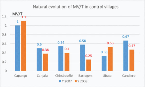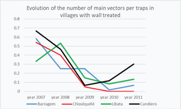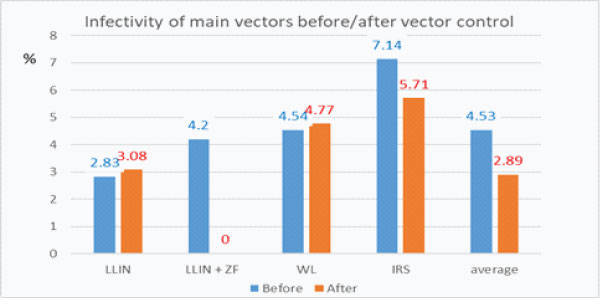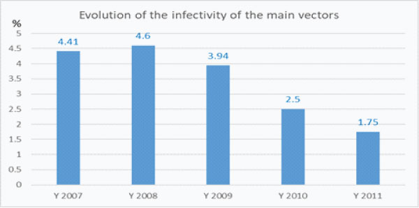 In 2009, the first year after vector control implementation, the infectivity decreased by 14% compared to 2008, then 36% from 2009 to 2010 then 30% from 2010 to 2011 meaning that in three years after vector control (from 2008 to 2011) the infectivity of main vectors decreased by 62%.