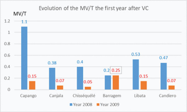 Results: During these 5 years (2 years before and 3 years after full vector control implementation) 202 CDC “night catching sessions” were done, representing 1880 “trap– night”, 1152 Anopheles were captured, belonging to 10 species, the main vectors (“MV”) were Anopheles funestus and An. gambiae. After implementation of VC the densities of “main– vector/traps” dropped by # 70%, similarly with the 4 VC methods (#63% with LLIN alone; #69% with the association LLIN +ITPS model “Zero Fly”; # 82% with ITPS model “Wall Lining” alone and #75 % after 2 rounds of λIRS followed by ITPS installation).