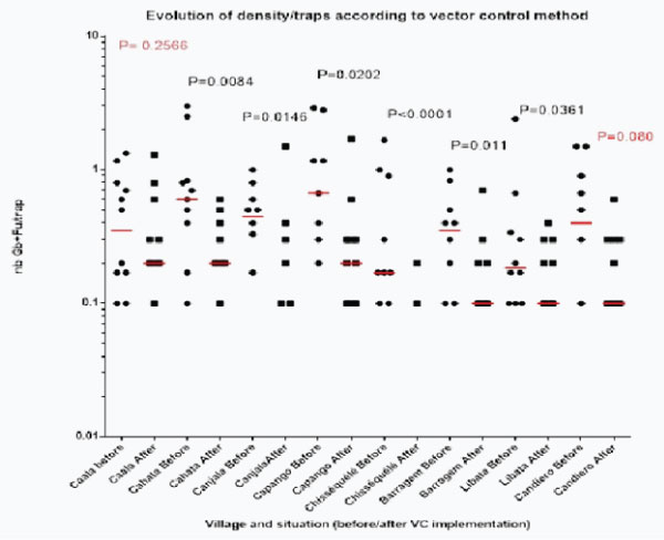 Considering only the 6 villages initially “control” the infectivity dropped form 5.20% (n= 269) before vector control implementation to 2.78% (n=108) after, which is not significant (X2 corrected= 0.56; P=0.42; OR=0.52 [0.15–1.85]).