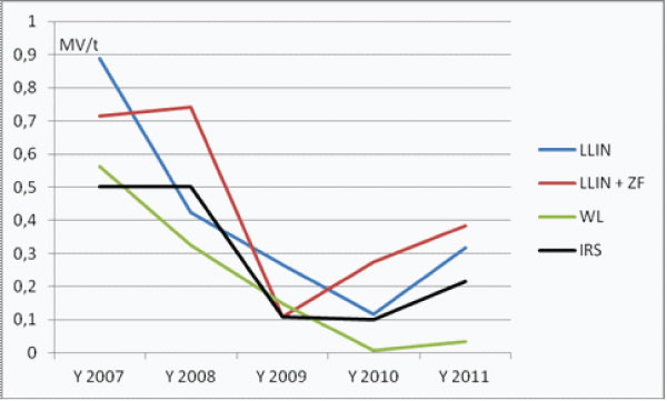 The strategy of NMCP combines preventive action and case management, mainly national scale distribution of Long lasting insecticide treated nets (LLIN), through different channels, and intermittent preventive treatment (IPT) to pregnant women [7] Rapid Detection tests (RDT) are distributed to improve timely reliable testing diagnosis [8] with treatments based on Artemisin Combined Therapy (“ACT”) since 2006 [3,9,10].