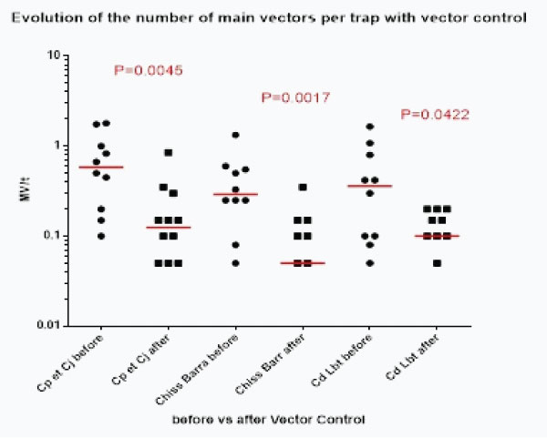 Graph 4c: Evolution of the infectivity of main vectors before and after vector control implementation.