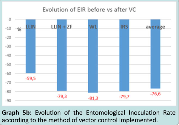 It thus appeared a great reduction of the entomological inoculation rate with each one of the vector control method implemented (graph. 5a) which can be estimated at 59.5% with LLIN, and # 79.3% with the association MMIN+ZF, 81.3% with Wall Lining alone and 79.7% with IRS followed by WL with an average of 77% reduction of the entomological inoculation rate after vector control implementation (Graph 5b).
