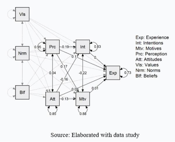 Extraction method: Main axes with promax rotation and obliquity criterion. Multivariate Kurtosis = 2.394; KMO=0.719; X 2 = 3.719, 15df, p = 0.000, F1 = Values (41% of the total variance explained), F2 = Beliefs (33% of the total variance explained), F3 = Perceptions (28% of the total variance explained), F4 = Motives (23% of the total variance explained), F5 = Attitudes (17% of the total variance explained), F6 = Norms (14% of the total variance explained), F7 = Intentions (9% of the total variance explained ); F8 = Experiences (7% of the total variance explained). M = Mean, SD = Standard deviation, C = Kurtosis |