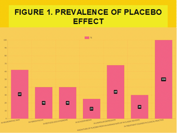 Results: Scientific evidence has shown that the placebo effect exists: it is a true biopsychosocial phenomenon produced by the context in which an intervention is carried out. The placebo is viewed from a different perspective in clinical trials or in clinical practice: 1. the placebo effect occurs in 100% of treatments in clinical practice; placebo effect is a part of all regular treatment. It's not drug or placebo; it’s drug and placebo. On the other hand, many doctors admit to regularly prescribing placebos, but there are marked differences on the frequency of their use, because of the different definition criteria, but with a high prevalence that is greater than 50% in the treatment courses; 2. Numerous clinical trials have calculated the magnitude or rate of the placebo effect in different clinical conditions. The magnitude of the placebo effect ranges from an average rate of 35% in classic reviews, 62% in neuropathic pain, 40% in fibromyalgia and restless legs syndrome, 25% in patients with schizophrenia and 68% in unipolar depression.