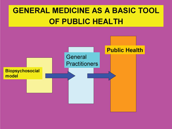 This article brings up the gap between public health and medical care. Much has been written about this divide and its consequences, but these efforts have been frustrated. The biopsychosocial model is put forward to better understand the impact of psychosocial factors on health and to stimulate greater interest of medical theory and practice in a more holistic approach. General medicine is a Public Health tool, and the working instrument of general medicine is the biopsychosocial model. In other words, the concepts of comprehensiveness and biopsychosocial approach are what give importance to general medicine as a basic tool of Public Health. The incorporation of a biopsychosocial perspective in general medicine results in a strengthening of the public health of the population. But this vision on the biopsychosocial model is still threatened by biomedical reductionism and does not resolve the dilemma between public health and general medicine. It is suggested to give more importance to the role of the general practitioner as a public health doctor, emphasizing the comprehensiveness of their work that allows the construction of scenarios for the health and life of communities.