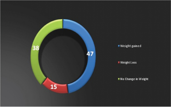 According to my survey, nearly half of the employees gained weight during the pandemic, which could be a risk factor for NCD in the participants. Only a tiny percentage of participants lost weight, but the majority remained the same as before the pandemic.