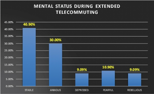 Employees had mental illnesses such as nervousness, rebelliousness, despair, and fearfulness, according to my research. During the Covid-19 crisis, however, the majority of them became mentally unwell due to telecommuting.